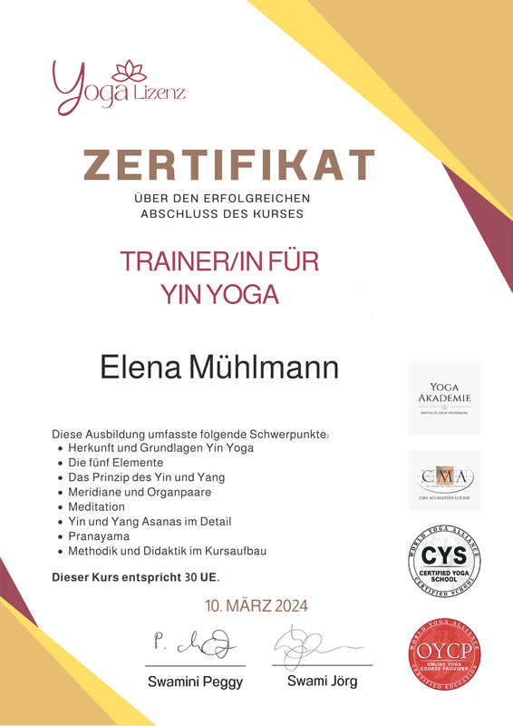 Ich habe die Ausbildung zur Yin-Yoga-Trainerin bei Yoga Vidya abgeschlossen. In 30 Unterrichtseinheiten lernte ich die Herkunft und Grundlagen des Yin Yoga, die fünf Elemente, Yin- und Yang-Asanas, Meridiane und Organpaare sowie Meditation, Pranayama und den methodischen Kursaufbau kennen.