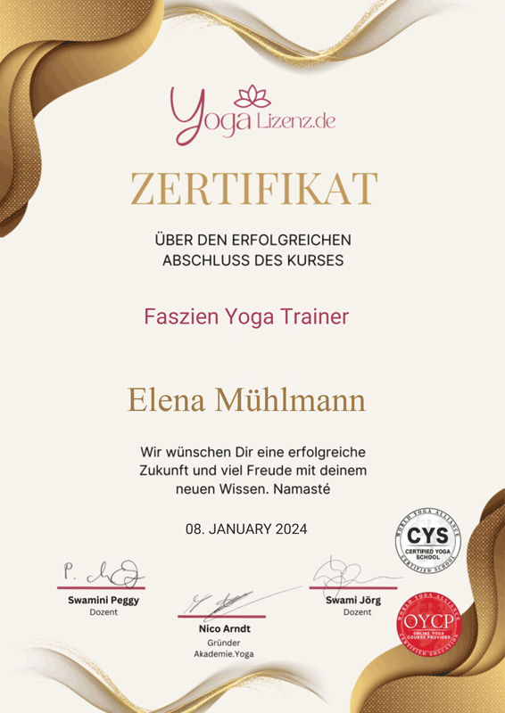 Ich habe die Ausbildung zur Faszien‑Yoga‑Trainerin bei Yoga Vidya abgeschlossen. Die rund 60 Unterrichtseinheiten vermittelten mir fundiertes Wissen zur Verbindung von Faszientraining und Yoga: inklusive Myofaszialer Asanas, wissenschaftlicher Hintergründe zur Faszienphysiologie und praxisnaher Übungen zur Gestaltung faszienfreundlicher Yoga‑Sequenzen – ideal für schmerzfreie Rückenarbeit und mehr Beweglichkeit.