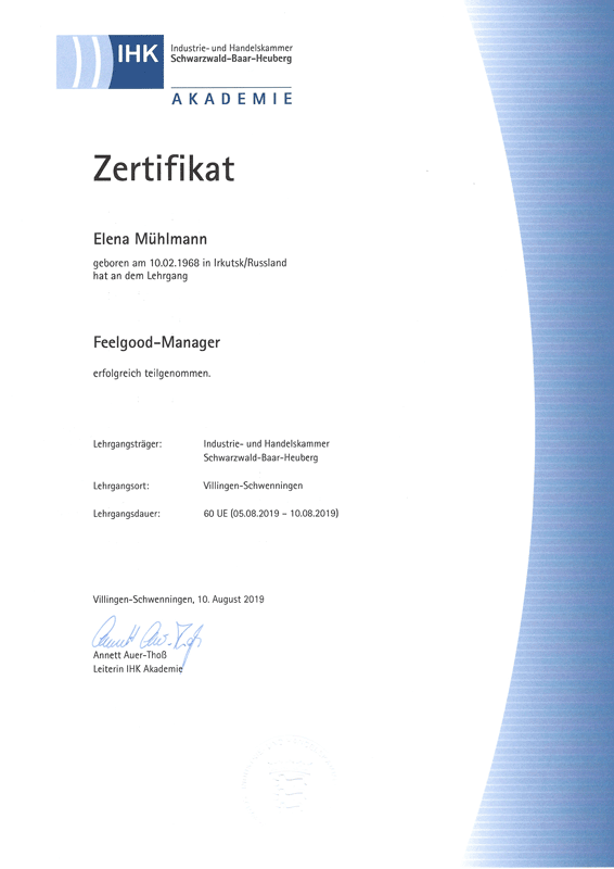 In der Weiterbildung „Feelgood‑Manager (IHK)“ standen zentrale Themen wie systematisches Feelgood‑Management, Resilienz, Achtsamkeit, Persönlichkeitsentwicklung, Teamentwicklung, Kommunikationskultur und das Konzipieren eines eigenen Feelgood‑Konzepts im Fokus