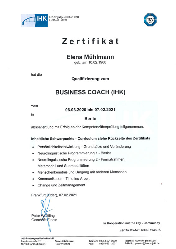 Die Qualifizierung vermittelte fundierte Kenntnisse in Persönlichkeitsentwicklung, Neurolinguistischer Programmierung (NLP), Menschenkenntnis sowie im professionellen Umgang mit Klienten. Weitere Schwerpunkte waren Timeline-Arbeit, Change-Management und Zeitmanagement.