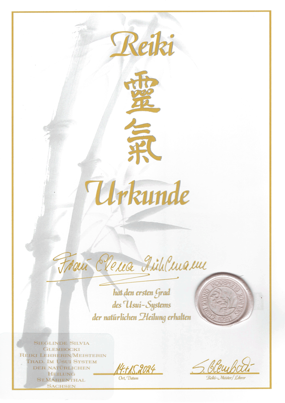 Ich habe den ersten Grad des Usui-Systems der natürlichen Heilung bei Sieglinde Silvia Glembocki (Reiki-Lehrerin/Meisterin, St. Marienthal) erfolgreich abgeschlossen. In der Ausbildung lernte ich die Grundlagen der Reiki-Energiearbeit, Handpositionen für Selbst- und Fremdbehandlungen sowie Techniken zur Stärkung von Achtsamkeit und innerer Balance.