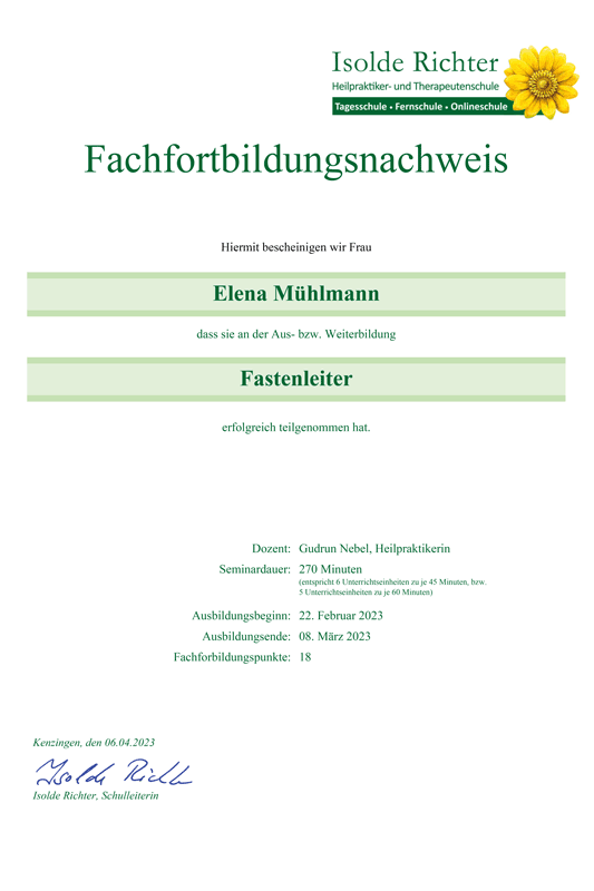 Im Rahmen des berufsbegleitenden Fastenleiter-Lehrgangs unter der Leitung der Heilpraktikerin und Dozentin Gudrun Nebel an der Heilpraktiker‑ und Therapeutenschule Isolde Richter erlernte ich 2023 die Fähigkeiten eines Fastenleiters. Dabei wurden fundierte Kenntnisse in den Bereichen Fastenmethoden, Planung und Begleitung von Fastenkuren, Erstellung von Fastenprotokollen sowie die Durchführung einer Online-Abschlussprüfung vermittelt.