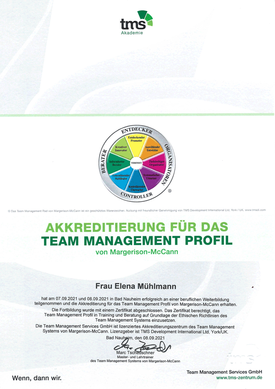 Im Akkreditierungslehrgang für das Team Management Profil nach Margerison‑McCann erwarb ich fundiertes Know-how zur Analyse individueller Arbeitspräferenzen und Teamrollen. Vermittelt wurden die acht essenziellen Tätigkeitsbereiche eines Hochleistungsteams sowie die Anwendung des Profils zur Teamentwicklung, Konfliktlösung, Stärkenförderung und Leistungssteigerung – alles auf der Basis eines wissenschaftlich fundierten, psychometrischen Instruments.