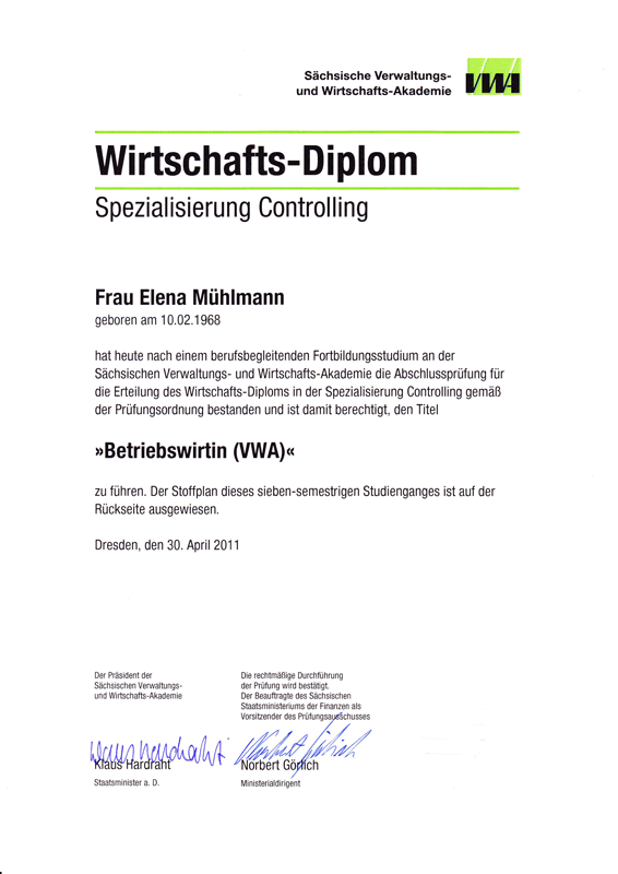 Nach einem berufsbegleitenden Fortbildungsstudium an der Sächsischen Verwaltungs- und Wirtschafts-Akademie erwarb ich das Wirtschafts-Diplom mit der Spezialisierung Controlling und dem Titel Betriebswirtin (VWA).
