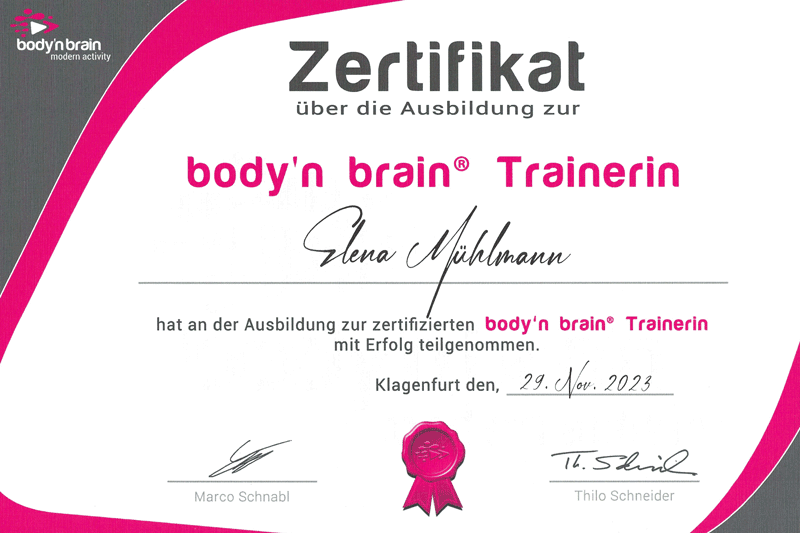 Im Jahr 2023 absolvierte ich in Klagenfurt die Ausbildung zur Body’n Brain Trainerin – einer wissenschaftlich fundierten Methode zur Förderung von Konzentrationsfähigkeit, schulischem Lernen und mentaler Balance durch gezielte Bewegungsübungen. Die Ausbildung umfasste praktische Übungen zur Verbesserung der Lernleistung, Strategien zur Stressreduktion bei Kindern, Förderung von Synapsenbildung im Gehirn sowie den Aufbau eigener Trainerkompetenz für Einzel‑ und Gruppentraining.