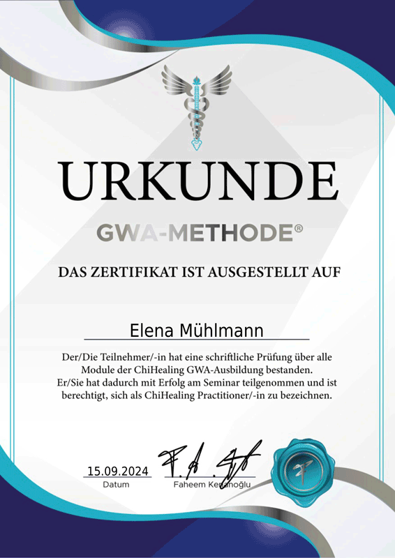 Ich habe die vollständige ChiHealing GWA-Ausbildung absolviert und die schriftliche Prüfung über alle Module erfolgreich bestanden. Damit bin ich offiziell zertifizierte ChiHealing Practitionerin. In der Ausbildung wurden unter anderem ganzheitliche Wahrnehmung, energetische Heilmethoden, Achtsamkeit sowie Techniken für körperliche und emotionale Balance vermittelt.